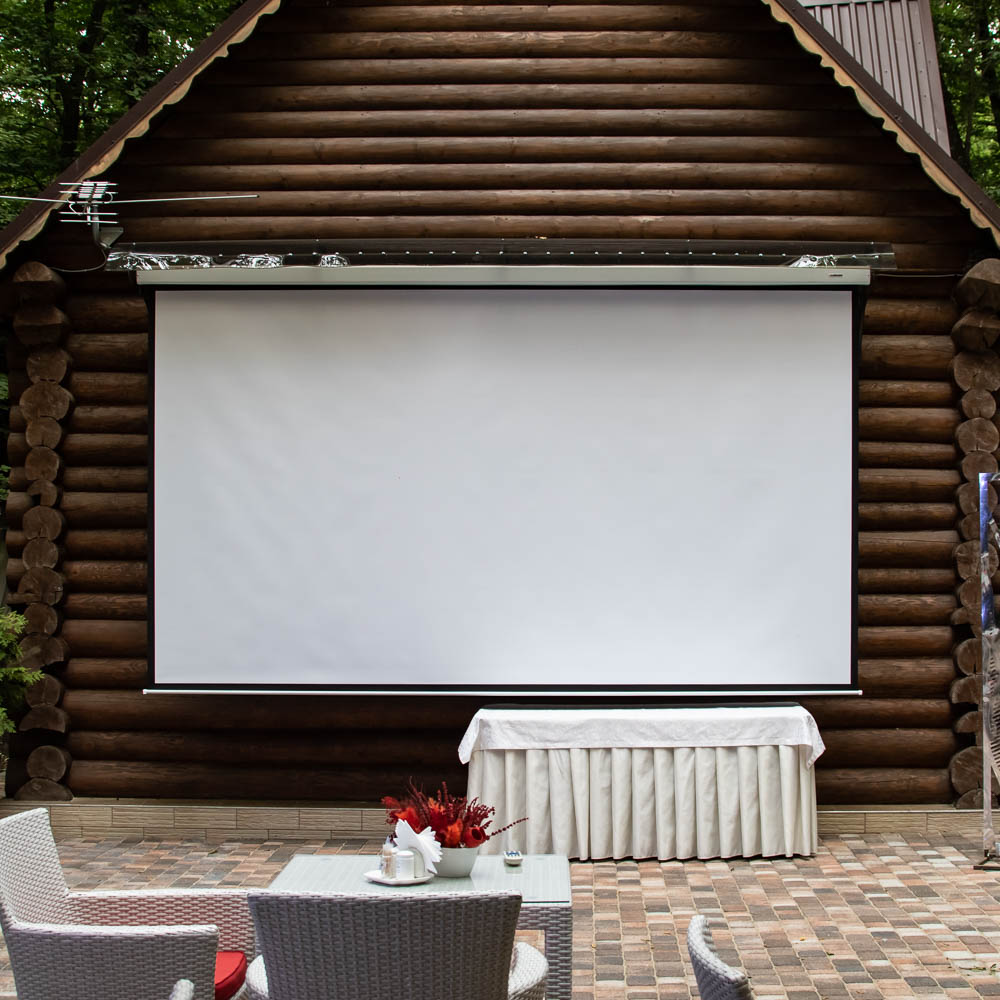 Использование летней площадки ресторана в качестве кинотеатра — понимая под этим не только собственно просмотр кинофильмов, а, скорее «большой телевизор», на которм можно смотреть и спортивные мероприятия, и концерты, и т. д. — гарантированный способ существенно повысить посещаемость заведения. На новой площадке ресторана «Лесная поляна» мы установили большой экран, видеопроектор и систему звукоусиления.