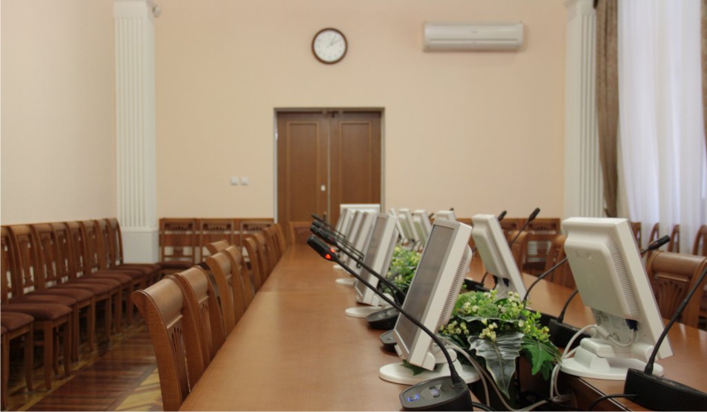 В процессе обсуждения задачи совместно со специалистами заказчика было принято решение демонтировать беспроводную конференц-систему, и заменить её на на более современную, но проводную (беспроводными остались лишь микрофоны на трибунах соискателя и оппонента), исключить из системы микшерный пульт, а также дополнить комплекс цифровой аудиоплатформой и интегрированной системой управления. Из установленного первоначально оборудования остались потолочные акустические системы (колонки) Philips (да-да, это было еще до приобретения компанией Bosch подразделения Philips Communications and Security), а также легендарные поворотные камеры Sony EVI-D30 и презентационный масштабатор Kramer.